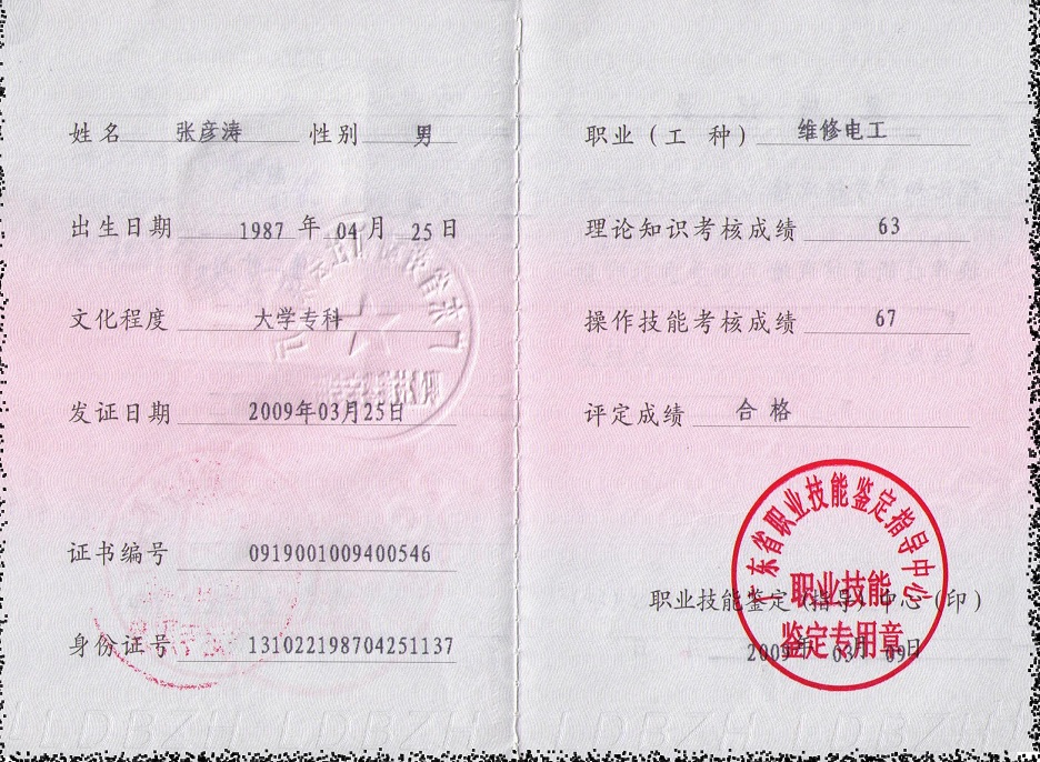 张彦涛维修电工资质证书